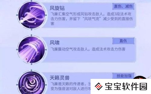 二技能“风啸”是一个纯粹的输出技能,主要是被动“天籁灵兽”,当“风埙气流”buff还存在时,飞廉的二技能变为强音波对敌人攻击4次。也就是说,只要一技能“风埙气流”没消失,飞廉的输出能力就可以大大提升,那么换到御灵团战时,当飞廉buff尚存,要小心自己的输出妖灵有被秒的可能,最好带一只护盾坦克。那么飞廉风属性克制水属性妖灵,螃蟹自然不能使用,这回巨灵神是个不错的选择。